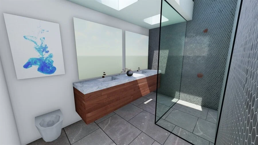 Remodel of Primary Bathroom in Cole Valley. Walk-in Shower, frameless entry door to WC, floating walnut vanity, custom designed shelving and towel nook. Included here as well are the initial concept renderings for comparison. The scope of this project also involved a remodel of a guest bath, addition of a laundry area, walk-in closet, and acoustic panels in the living room.